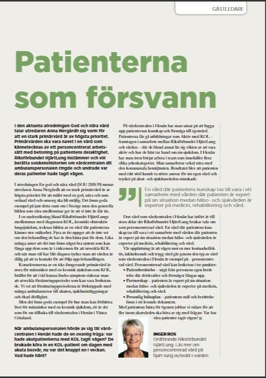 Riksförbundet HjärtLungs ordförande Inger Ros skriver i Medicinsk Access nummer 3 2017 om...