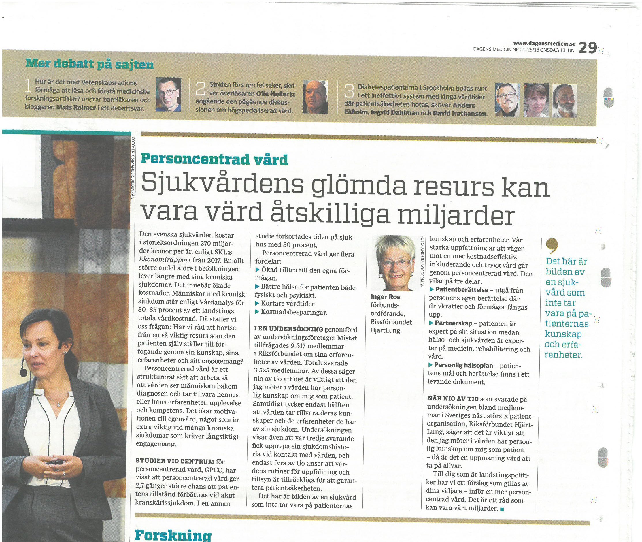 - Det här är bilden av en sjukvård som inte tar vara på patienternas kunskap och erfarenheter. Vår uppfattning är att vägen mot en mer kostnadseffektiv, inkluderande och trygg vård går genom personcentrerad vård, säger Inger Ros, förbundsordförande Riksförbundet HjärtLung.