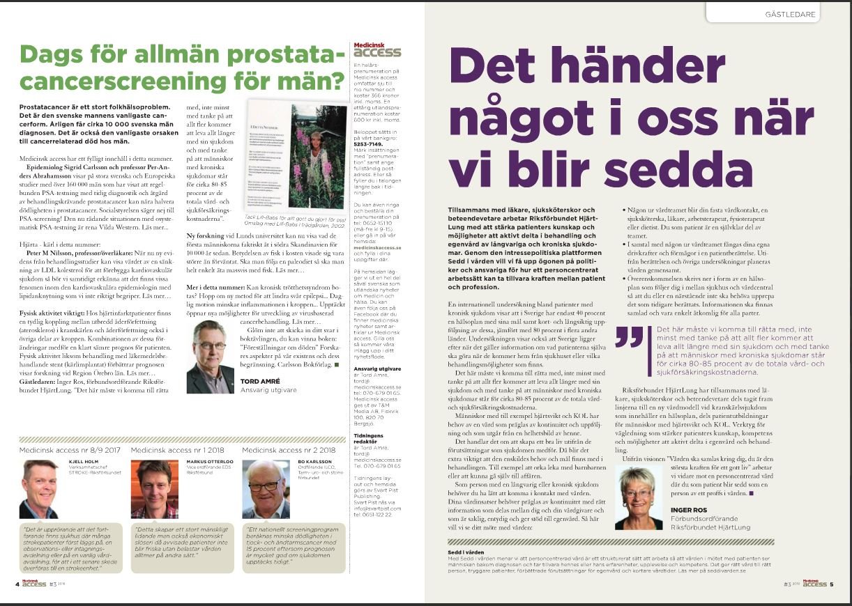 Människor med till exempel hjärtsvikt och KOL har behov av en vård som präglas av kontinuitet och uppföljning och som utgår från en helhetsbild av henne.Det handlar det om att skapa ett bra liv utifrån de förutsättningar som sjukdomen medför. Då blir det extra viktigt att den enskildes behov och mål finns med i behandlingen, skriver Inger Ros i Medicinsk access om Riksförbundets kampanj Sedd i vården.