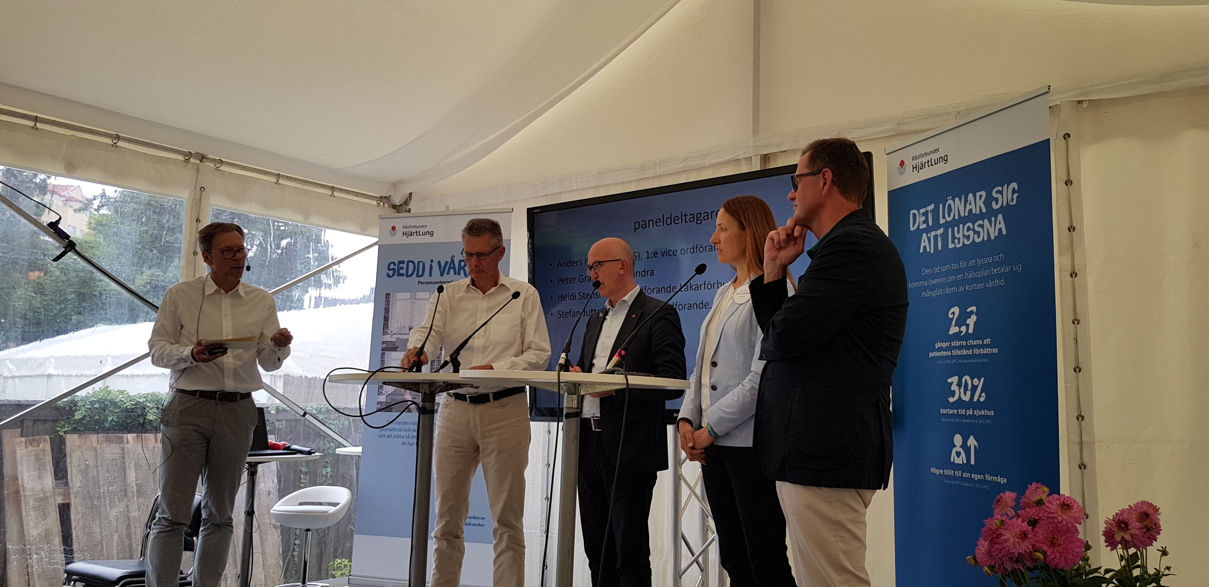 Efter Inger Ros inledning och Ida Björkmans anförande om bakgrunden till personcentrerad vård och till Centrum för personcentrerad vård i Göteborg, GPCC, bjöd seminiariets moderator Pär Hommerberg upp panelen bestående av SKL:s 1:e vice ordförande Anders Henriksson, Läkarförbundets ordförande Heidi Stensmyren, Tiohundras VD Peter Graf och Fysioterapeuternas ordförande Stefan Jutterdal, för att diskutera personcentrerad vård i allmänhet och ett partnerskap mellan patient och profession i synnerhet.