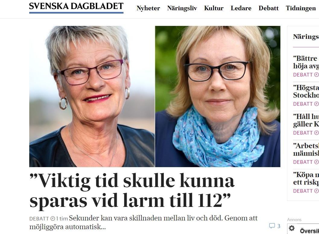I en debattartikel i Svenska Dagbladet skriver Inger Ros, Riksförbundet Hjärtlung, och Maritha Sedvallson, Astma- och allergiförbundet att genom att möjliggöra automatisk positionering och skapa en sammanhållen larmkedja har den nya regeringen nu en verklig möjlighet att kapa tiden det tar från att en person ringer 112 till att ambulans är framme.