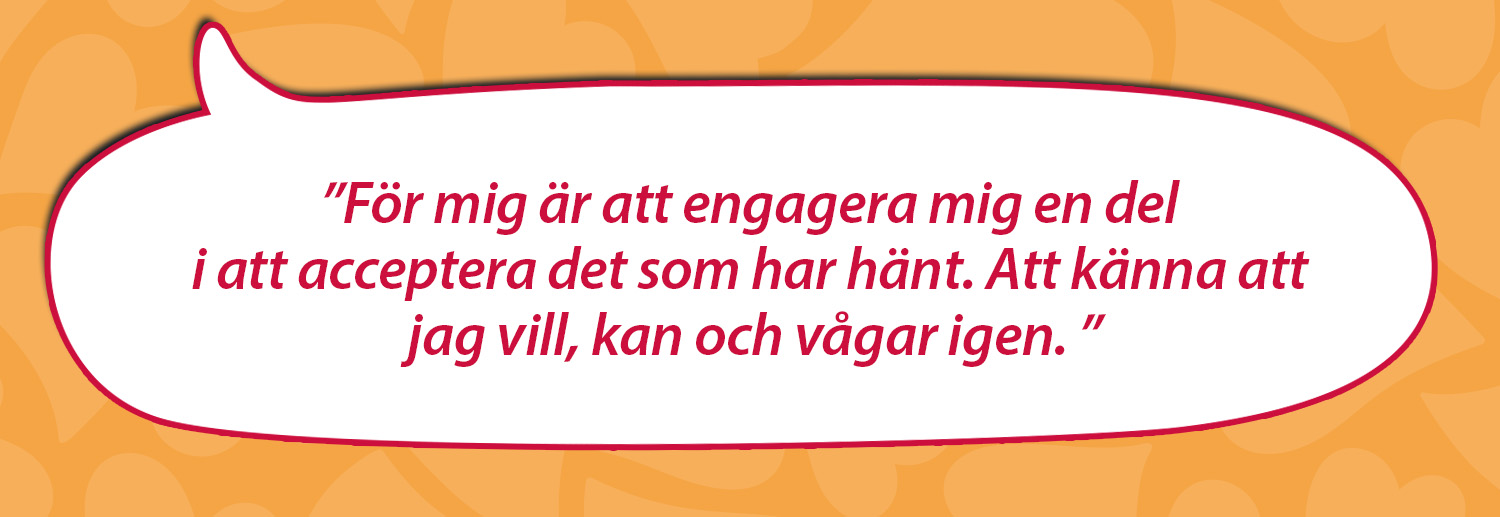 – För mig är att engagera mig en del i att acceptera det som har hänt. Att känna att jag vill, kan och vågar igen. Nu är mina hjärtproblem en del av mig och vi går vidare tillsammans. Mitt hjärta mår bra, jag har kontroll och tar hand om det på bästa sätt.