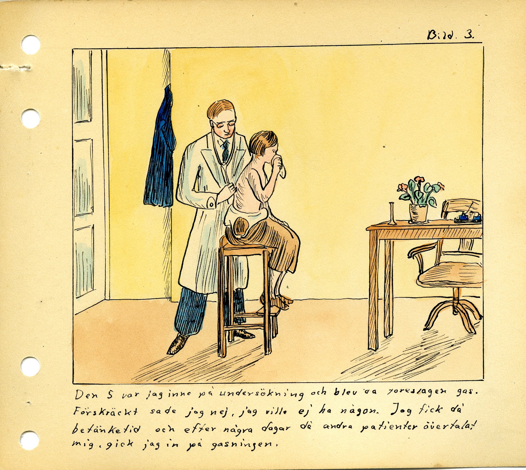 Bildtext: ”Den 5:e maj var jag inne på undersökning och blev då föreslagen gas. Försträckt sade jag nej, jag ville ej ha någon. Jag fick då betänketid och efter några dagar då andra patienter övertalat mig gick jag in på gasningen.”