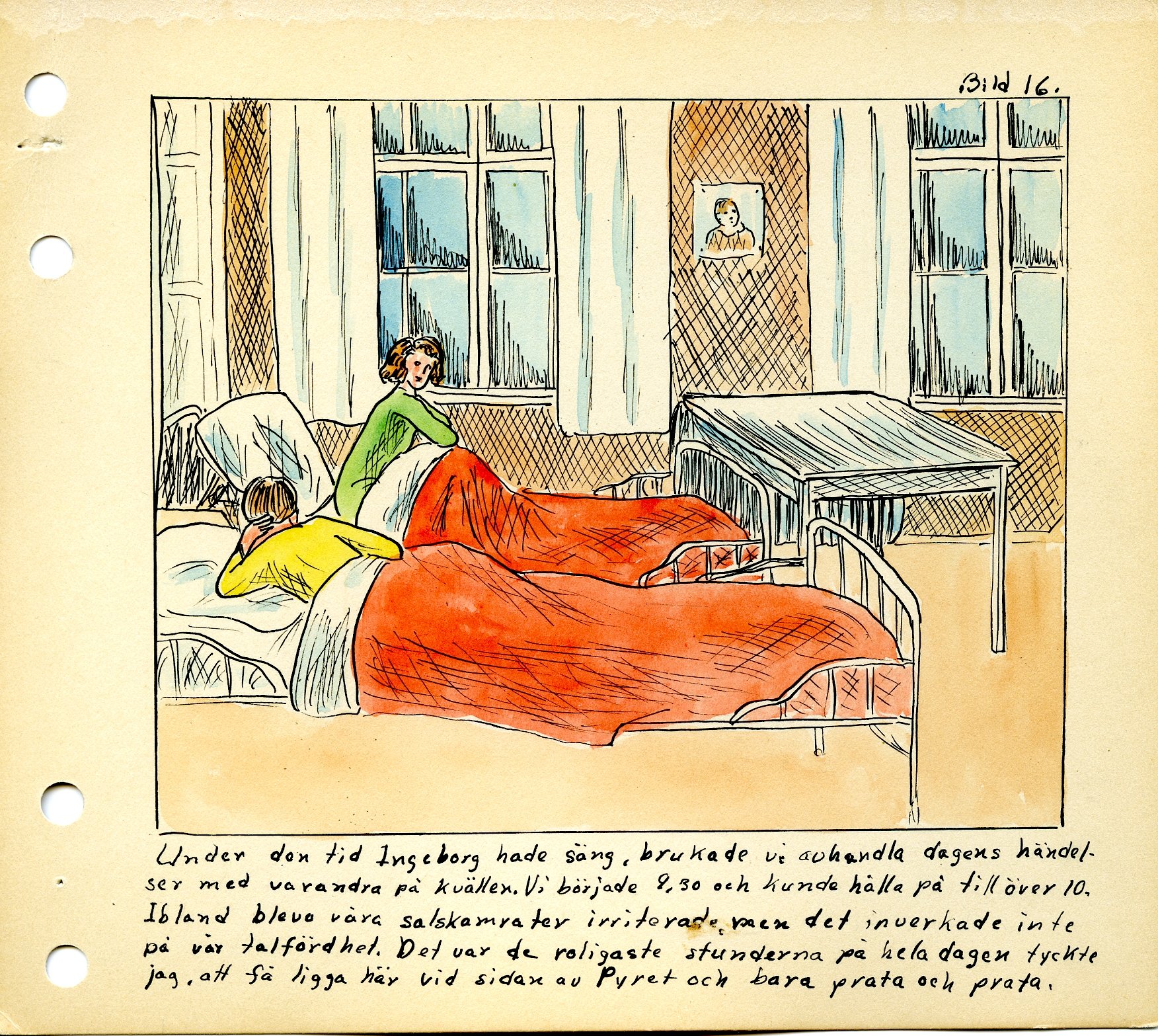 Bildtext: ”Under den tid Ingeborg hade säng brukade vi avhandla dagens händelser med varandra på kvällen. Vi började 9.30 och kunde hålla på till över 10. Ibland blevo våra salskamrater irriterade men det inverkade inte på vår talfördhet. Det var de roligaste stunderna på hela dagen tycket jag, att få ligga här vid sida av Pyret och bara prata och prata. ”