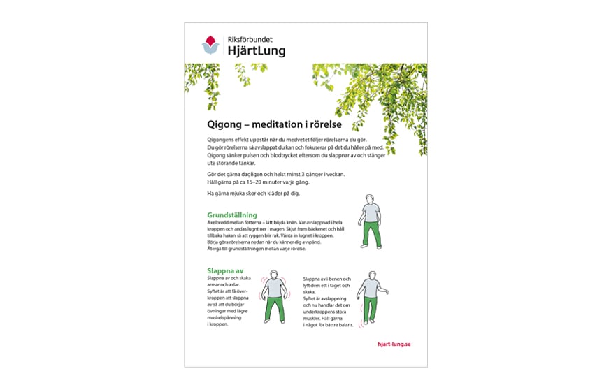 Qigong sänker pulsen och blodtrycket eftersom du slappnar av och stänger ute störande tankar. Gör det gärna dagligen och helst minst 3 gånger i veckan. Håll gärna på ca 15–20 minuter varje gång. Ha gärna mjuka skor och kläder på dig.
