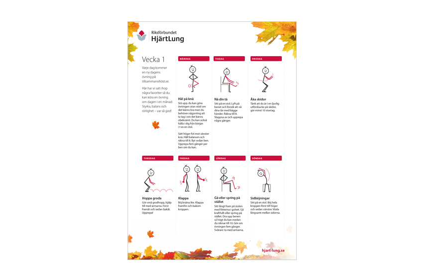 Här hittar du ett träningsprogram baserat på dagens övning. Varje dag får du tre övningar för en och samma muskelgrupp. Under en vecka går vi igenom ben, armar, mage och rygg, balans, rörlighet, nacke samt avslutar med hopp och skutt. Utmana dig själv och kör programmet i en månad