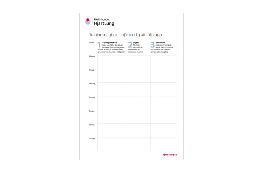 Här kan du ladda ned eller skriva ut en träningsdagbok. Andra sätt att öka motivationen är till exempel att använda en stegräknare. Stegräknare finns i olika varianter, från enkla till avancerade, men också inbyggt i många smarta telefoner.