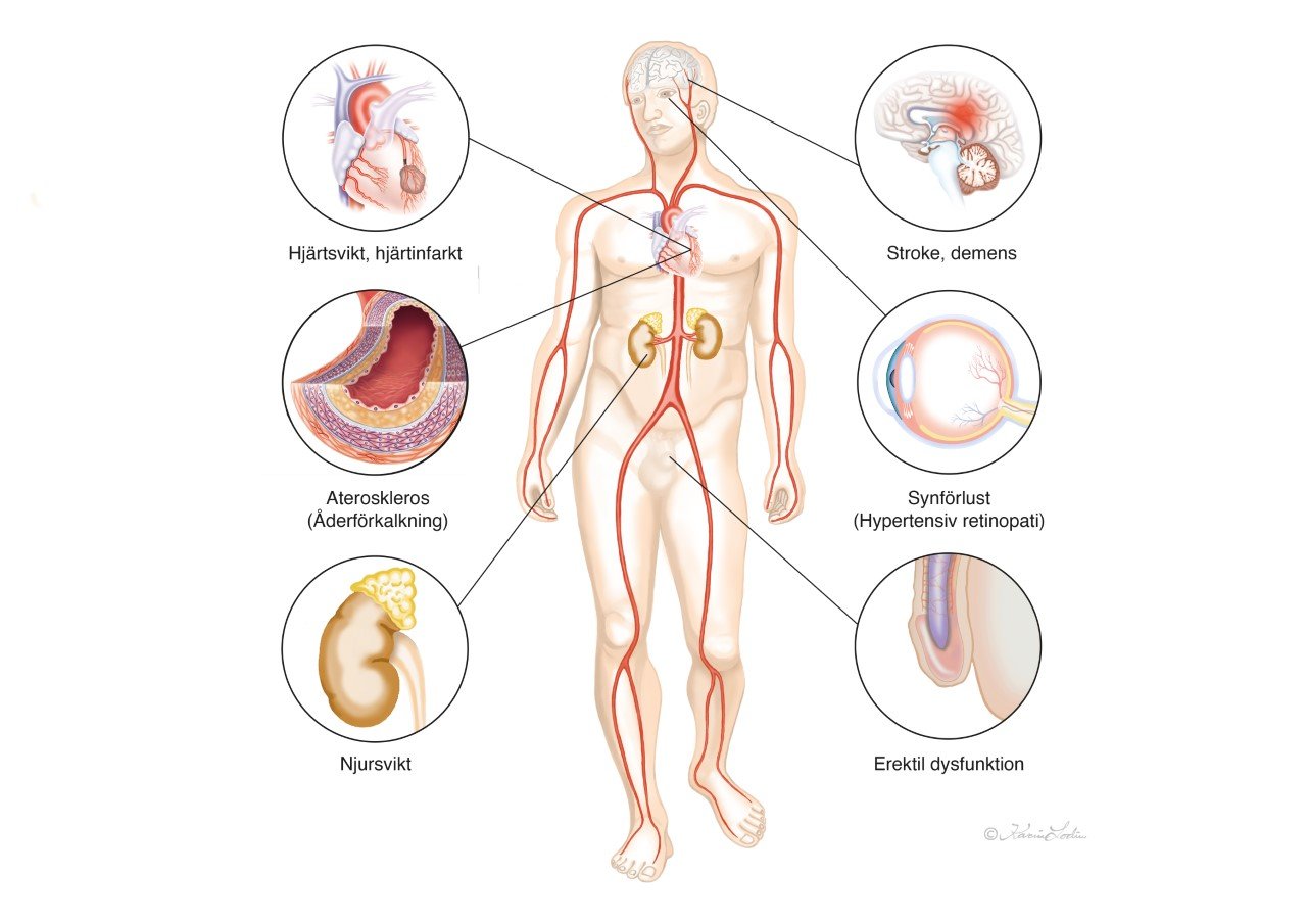 Högt blodtryck brukar kallas "den tysta sjukdomen", eftersom det sällan ger några symtom. Dessvärre gör det stor skada i kroppen. Risken för framför allt stroke, men också hjärtsvikt, hjärtinfarkt och njurproblem ökar.
