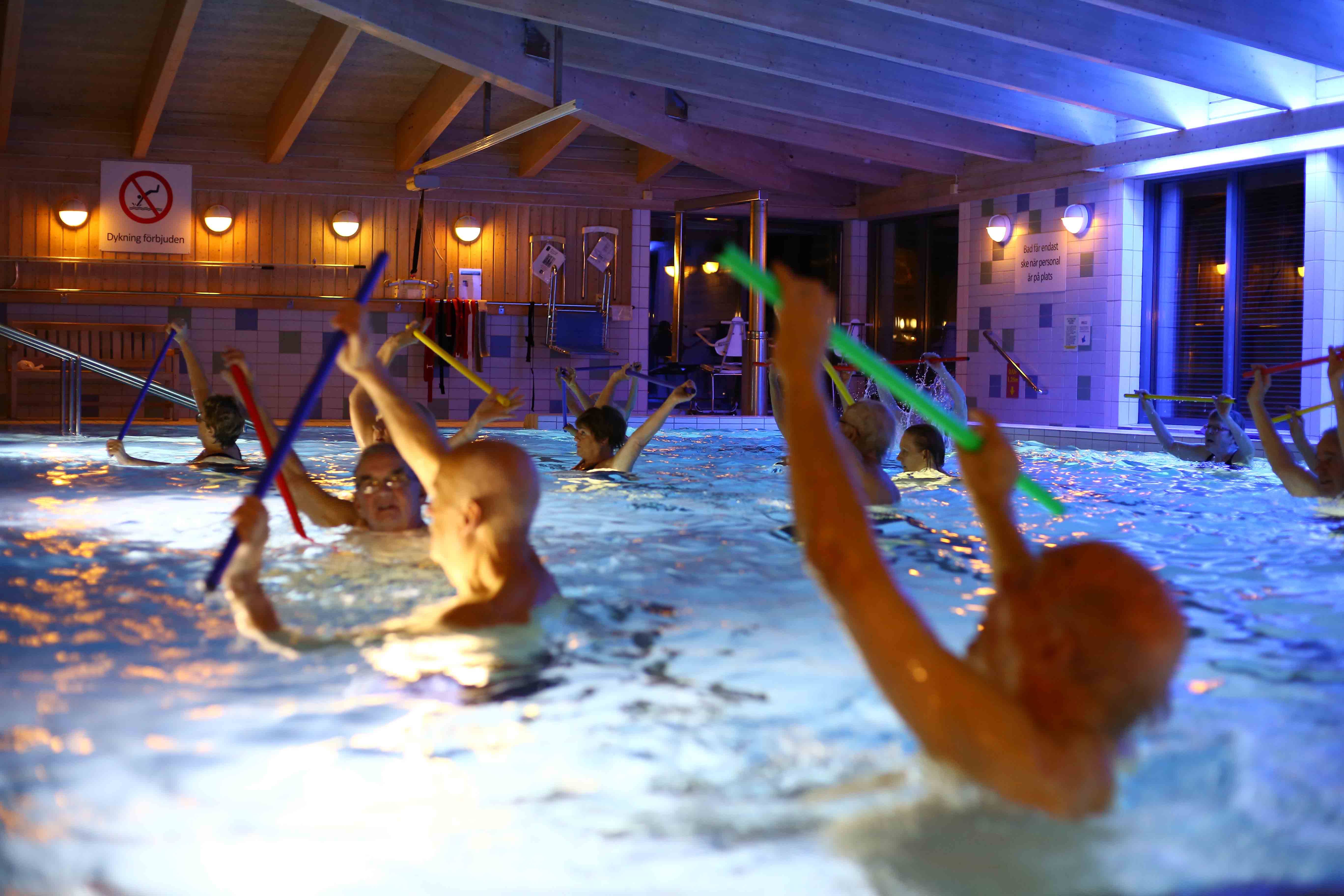 Badet på Hemgårdens äldrecentrum är ett så kallat terapibad vilket bland annat innebär att vattentemperaturen är lite högre än på ett vanligt badhus, något som uppskattas av deltagarna.